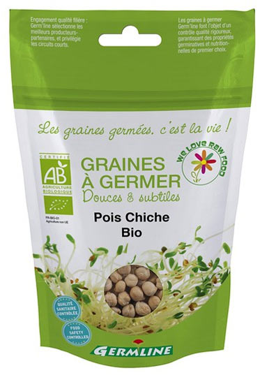 Les graines germées bio de pois chiche sont riches en fer, phosphore et en vitamines B1, B2, B3, C et A.