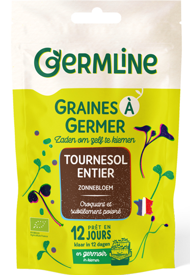 Les graines germées bio Germ'line de tournesol se consomment en pousses crues sur les salades, les crudités, en germes à croquer en apéritif.